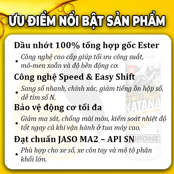 • Ưu điểm: Giảm ma sát và mài mòn, tăng tuổi thọ động cơ, sang số êm, vận hành mượt mà, giúp động cơ mát hơn và tiết kiệm nhiên liệu vượt trội.